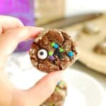 Halloween baking that’s festive and approachable? Yes, please! This recipe has no specialty ingredients, just your standard pantry staples (plus some optional decorating ingredients like sprinkles or edible eyeballs). The result is a chewy, crackled cookie that’s got some brownie-ish vibes, with hints of pumpkin spice flavor intertwined with the cocoa in each bite.